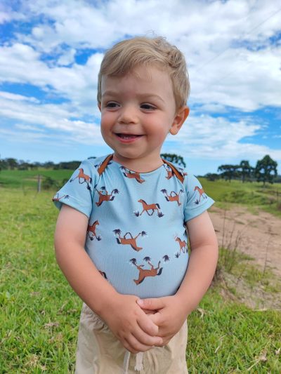 Bebê confortável e mini adorador de cavalos, precisa estar com o body Potros no look!