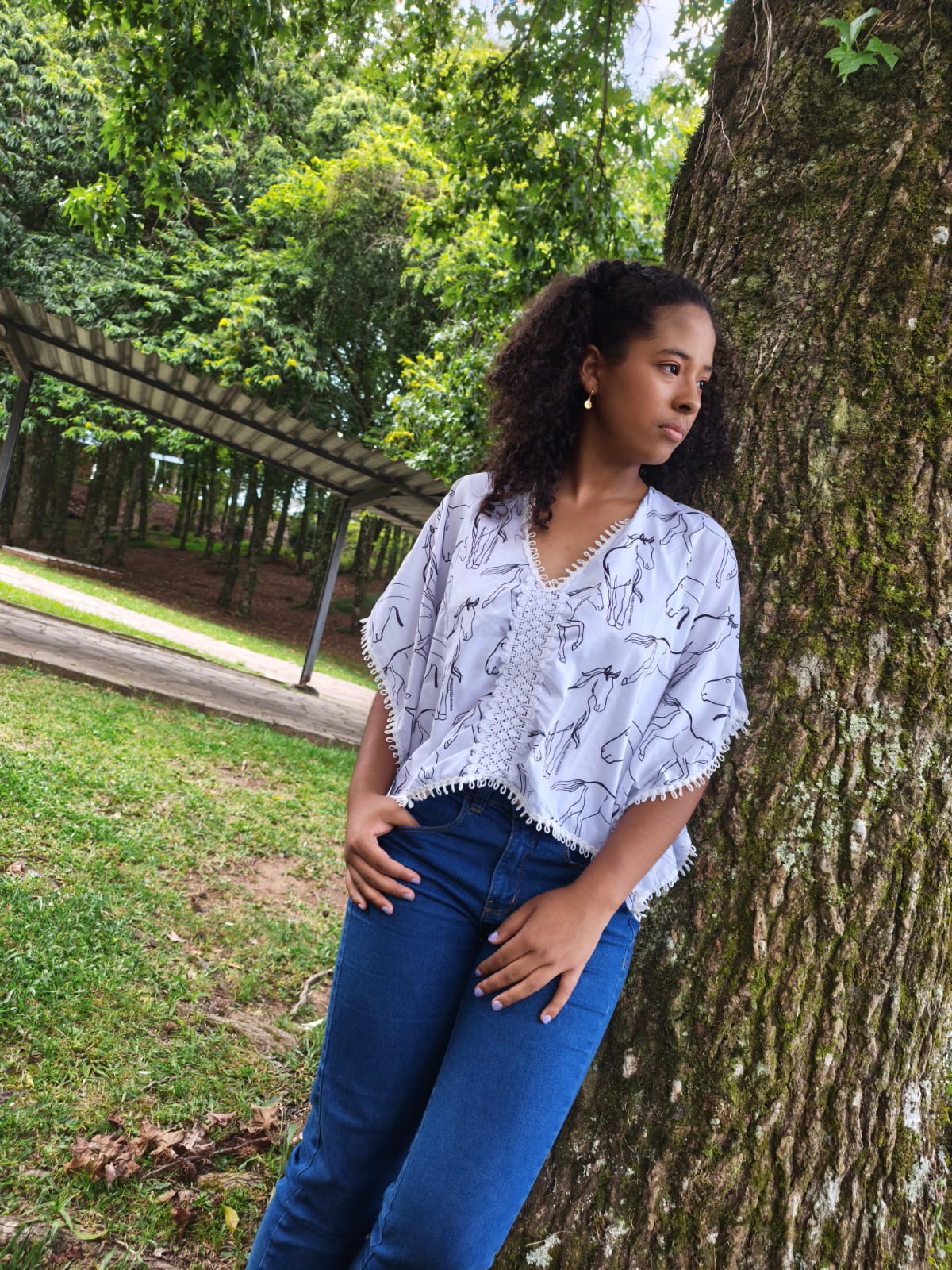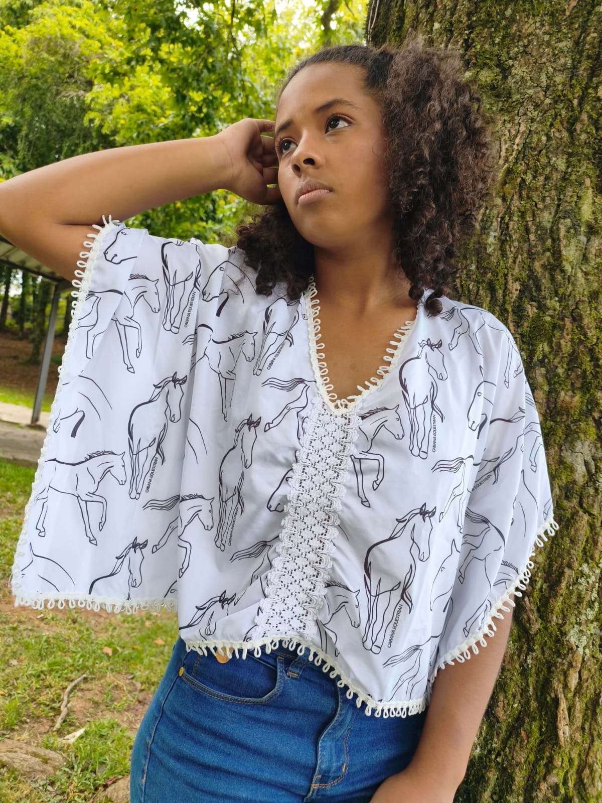 Cor: Branca com estampa de cavalos em preto