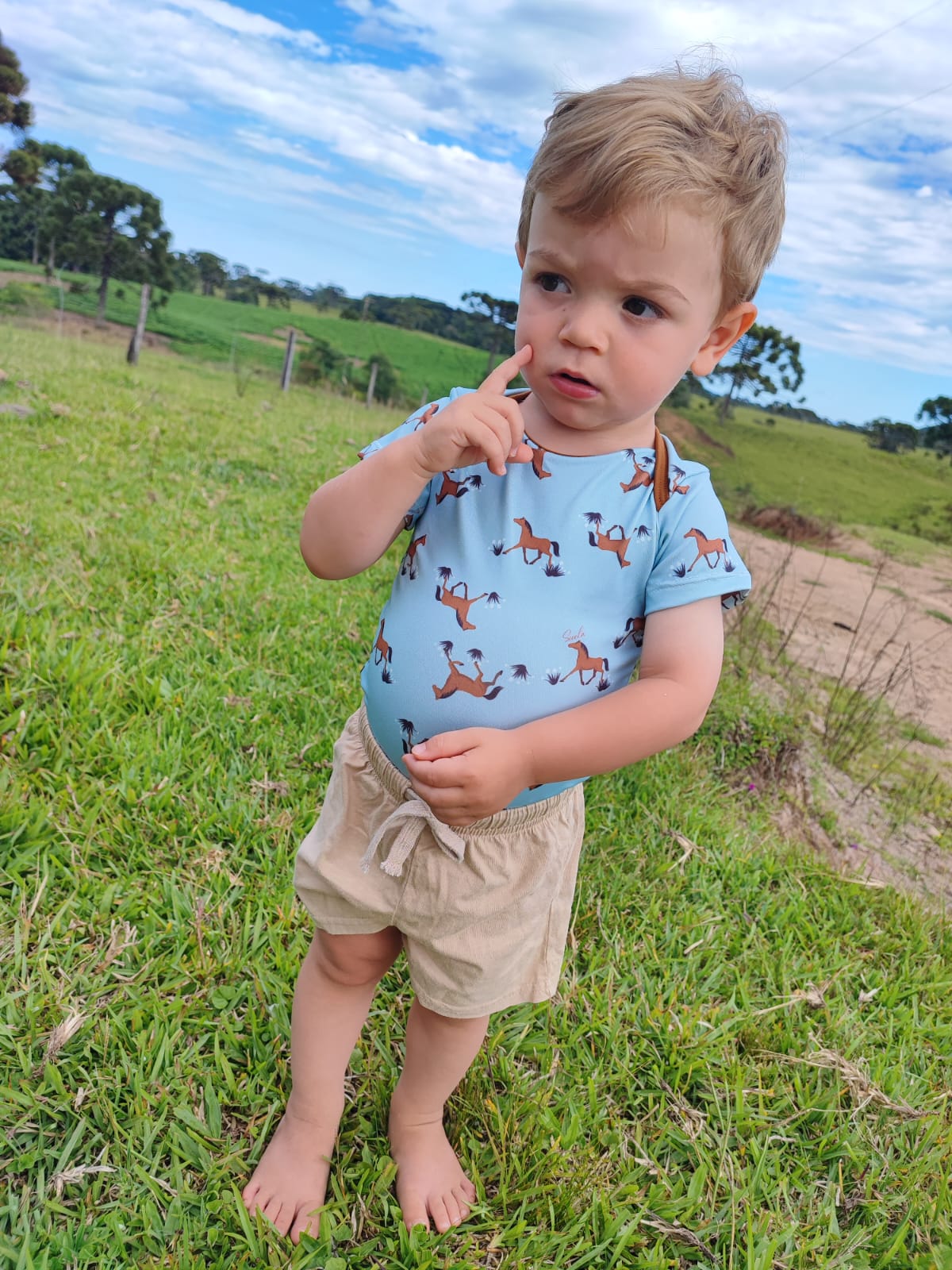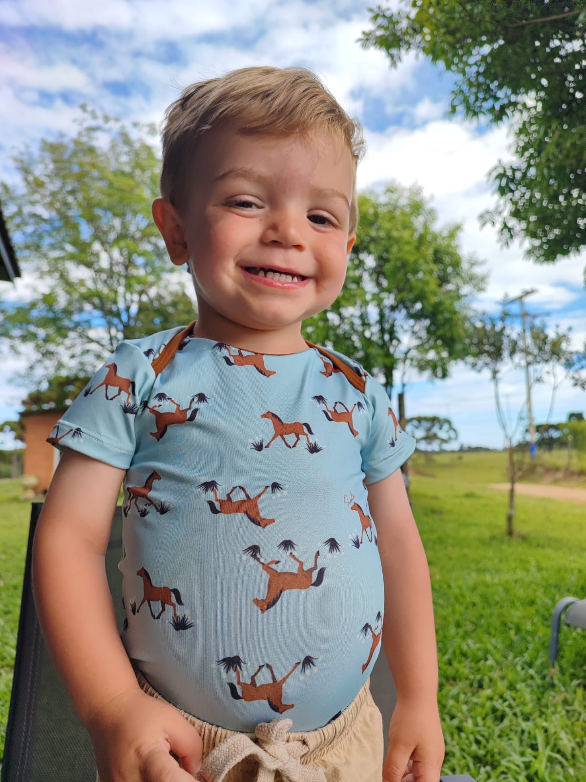 Bebê confortável e mini adorador de cavalos, precisa estar com o body Potros no look!