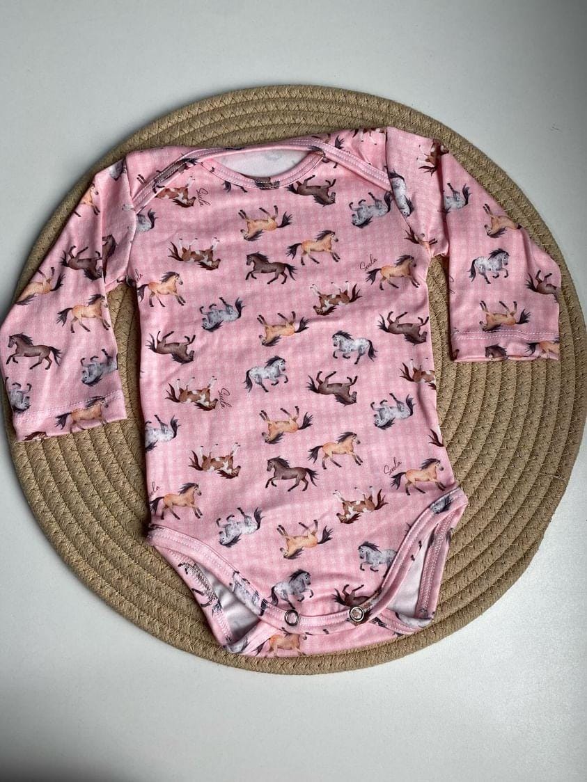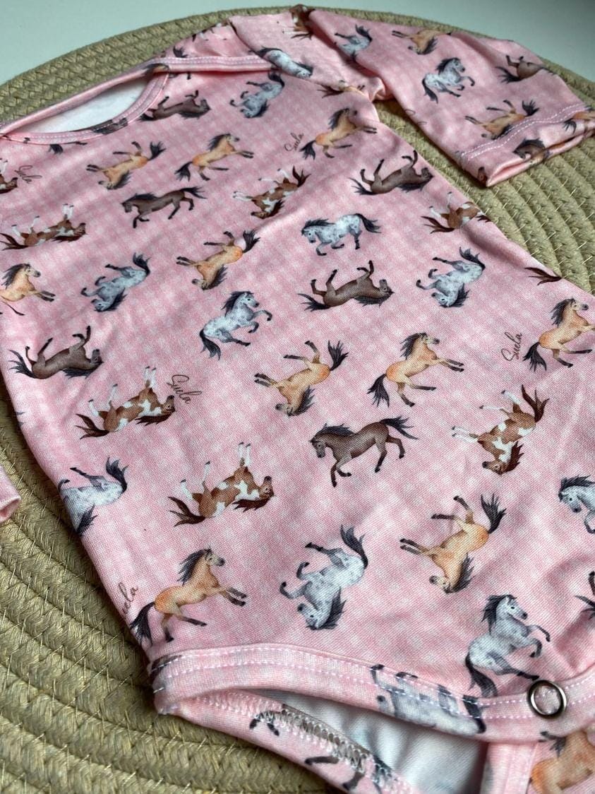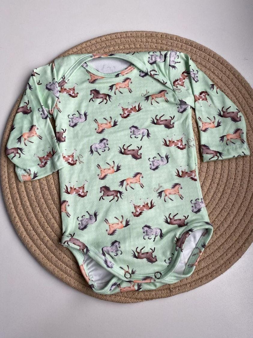 Body Bebê manga longa, em marrom e preto com estampa de cavalos!