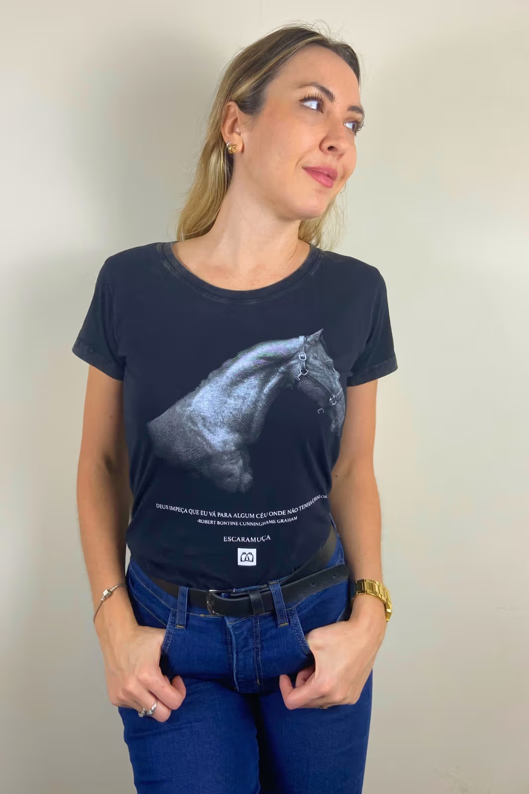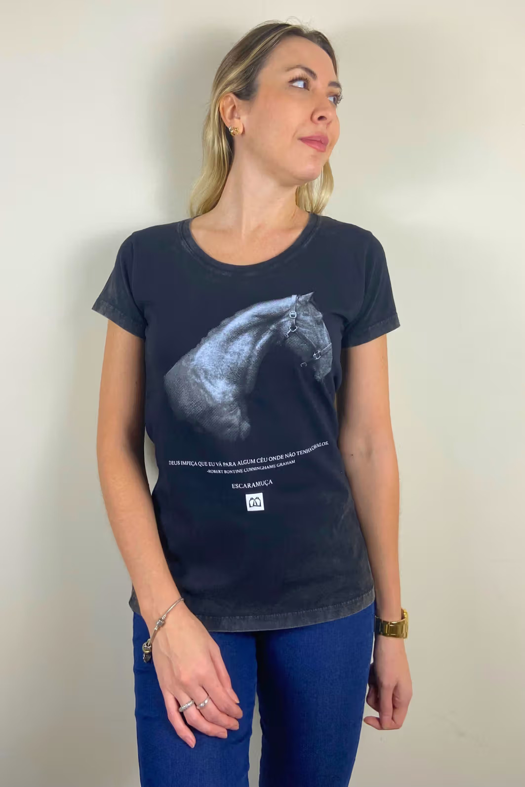 A T-Shirt Estampada CÉU é aquela peça que fala por si. Com a frase “Deus impeça que eu vá para algum céu onde não tenha cavalos”. Robert Graham logo abaixo de um perfil elegante de cavalo, já diz tudo sobre quem veste: um amante da vida equestre!