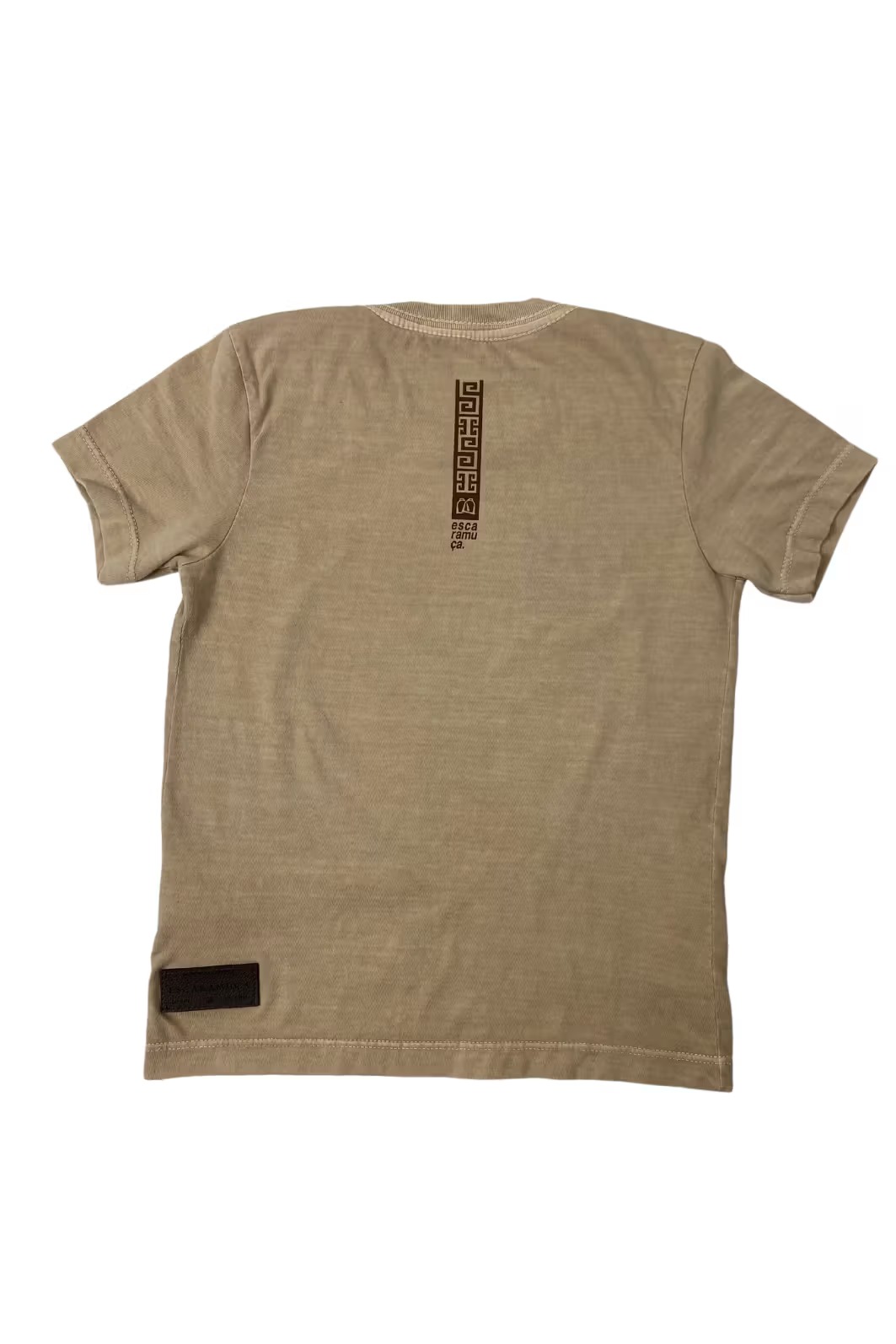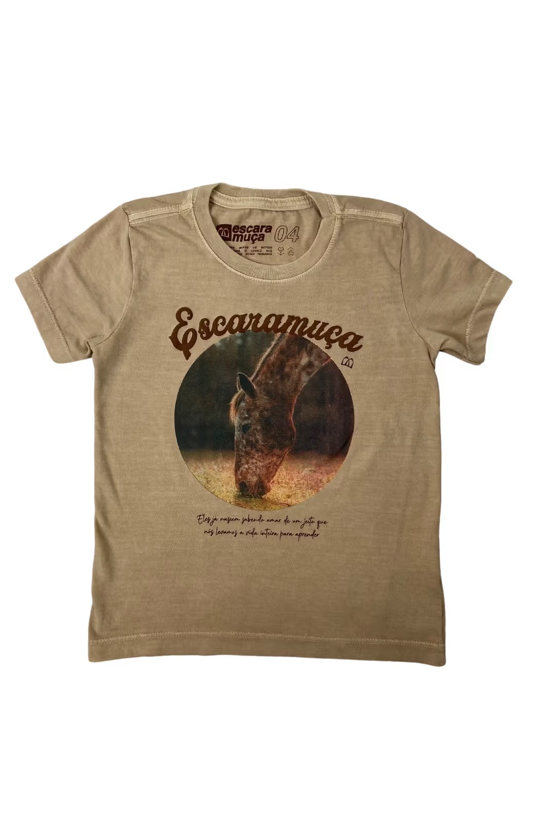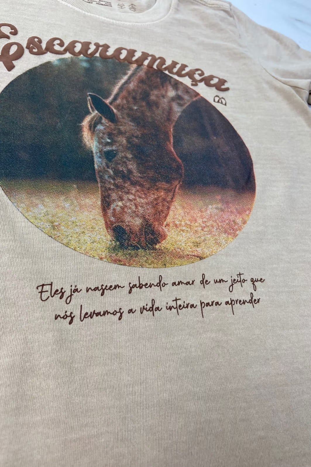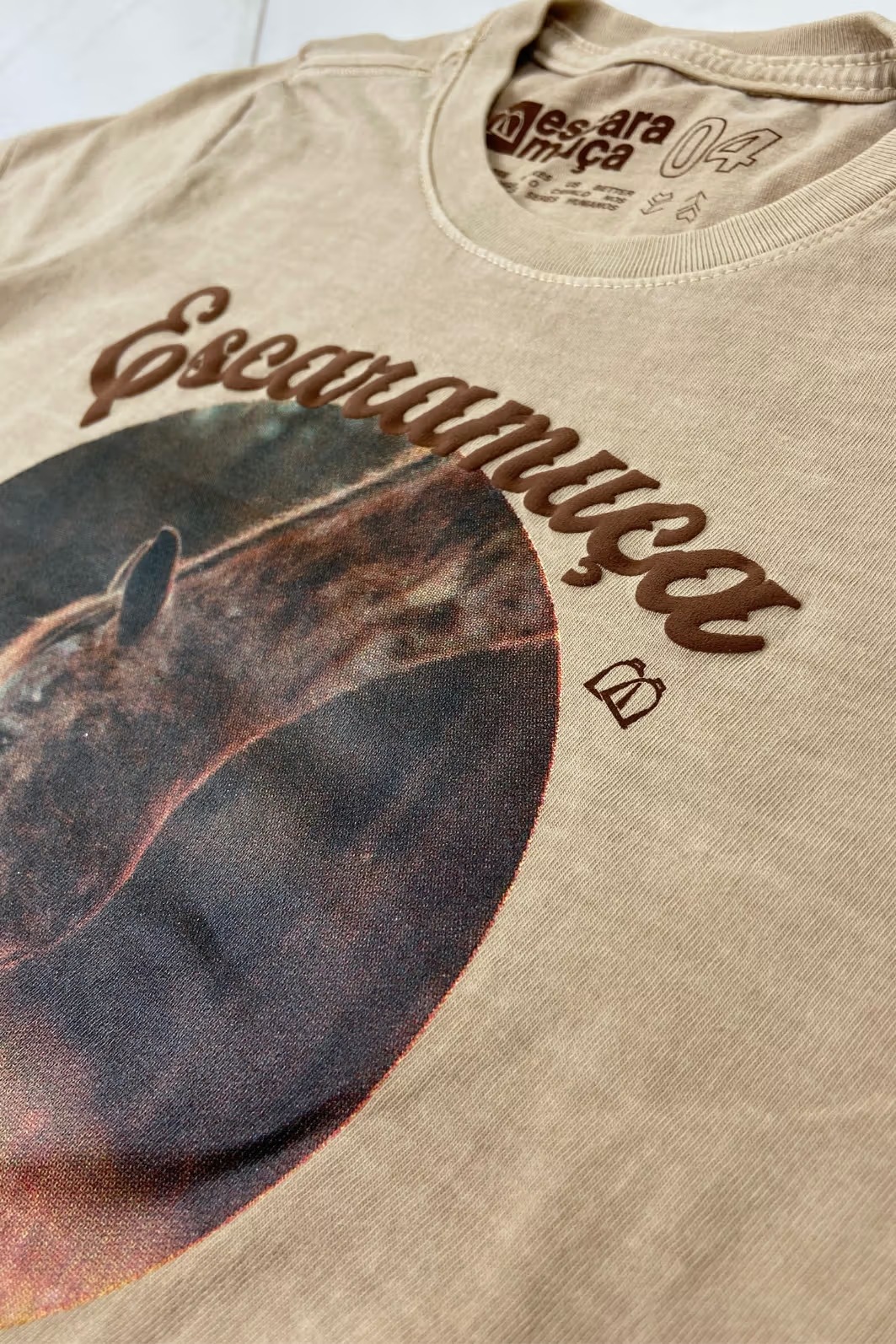 T-shirt em malha 100% algodão premium, lavada e tingida na cor amêndoa e escrita em relevo gel