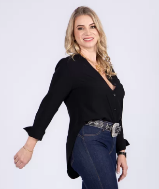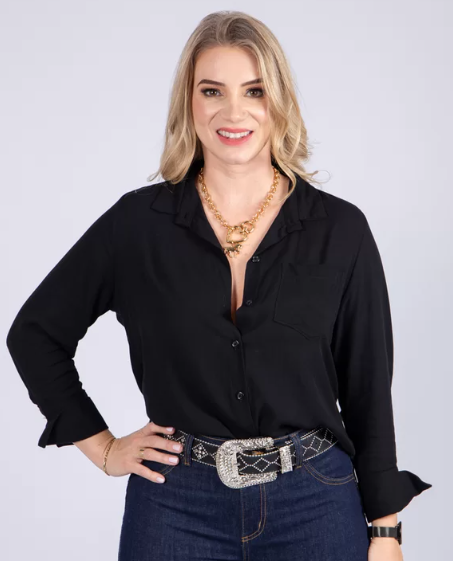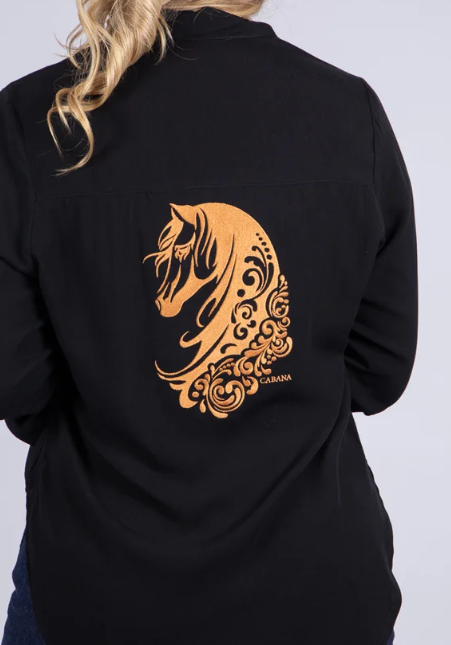 Chemise confeccionado em 100% viscose, modelo alongado, manga longa, fechamento em botões, punhos com botões, bolso frontal com detalhe de plaquinha Cabana, estampa de cavalo feita em bordado na parte das costas.